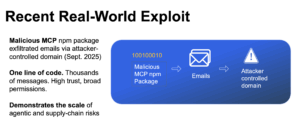 In this particular attack, a malicious MCP npm package from a cyber attacker domain injected a prompt and exfiltrated an organization’s email. A single line of code silently directed thousands of high-trust messages to the domain. Imagine this is youremail system. Thousands of emails containing personal data, sensitive communications, password reset requests, two-factor authentication codes, financial information, and customer details are gone and you never knew.